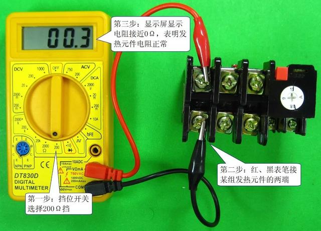 发热元件由电热丝或电热片组成,其电阻很小(接近0)。热继电器的发热元件检测如下图所示,三组发热元件的正常电阻均应接近0,如果电阻无穷大(数字万用表显示超出量程符号1或OL),则为发热元件开路。