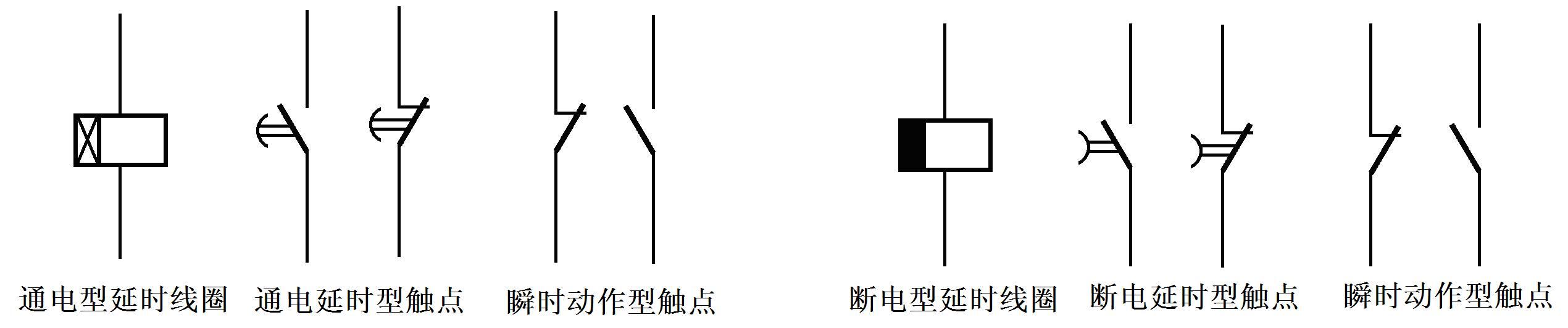 时间继电器分为通电延时型和断电延时型两种,其符号如下图所示。对于通电延时型时间继电器,当线圈通电时,通电延时型触点经延时时间后动作(常闭触点断开、常开触点闭合),线圈断电后,该触点马上恢复常态;对于断电延时型时间继电器,当线圈通电时,断电延时型触点马上动作(常闭触点断开、常开触点闭合),线圈断电后,该触点需要经延时时间后才会恢复到常态。