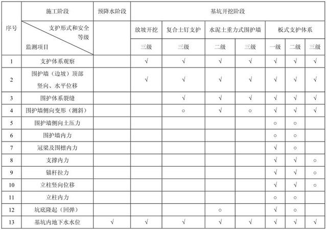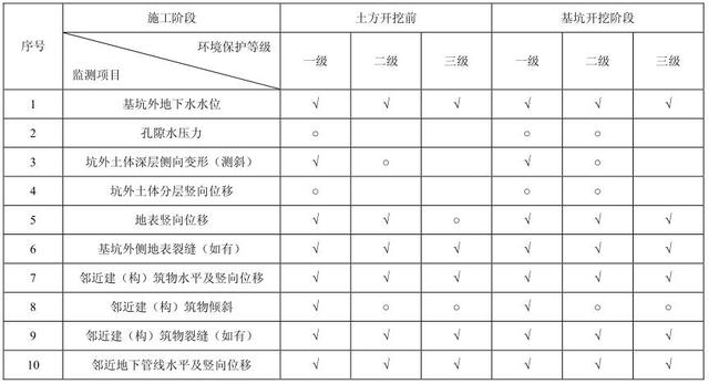 表 2.9-2 根据基坑工程环境保护等级选择周边环境监测项目表