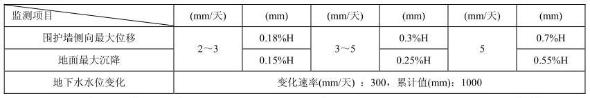 基坑工程监测应及时测报初始值,并在监测实施前根据基坑工程的特点确定监测报警值,以便在基坑工程实施期间及时发现风险点并采取有效措施保证基坑工程的安全顺利进行和周边保护对象的正常工作和使用。一般情况下,监测报警值应根据基坑围护设计、周边环境的承受能力以及工程经验具体分析综合确定,当无可靠经验时,也可参考表 2.9-3 和 2.9-4确定。