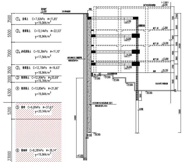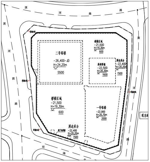 裙楼和塔楼基坑作为一个整体同步实施,根据本基坑工程的面积和开挖深度、地下室外墙与红线的关系以及周边的环境,本工程应采用板式围护体结合坑内设置多道支撑的支护体系。
