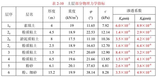 拟建场地位于天津市塘沽区海河南岸,场地总体地势平坦,仅四周地势略高,地面大沽高程介于 2.04~1.25m。基坑开挖深度范围之内的场地土层主要以粉质粘土为主,浅层分布有较厚的流塑淤泥质粘土,深层分布有深厚的粉、细砂微承压含水层,微承压含水层顶板已基本接近基坑底部。场地内土层部分物理力学指标如表 2-10 所示。