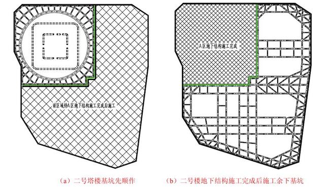 考虑到 358m 高的二号塔楼的工期是本工程的控制工期,为加快整体工程的工期,首先对该塔楼区域进行单独围护,采用顺作法施工,待该基坑工程结束、进入上部结构的施工之后,才采用顺作法实施剩余的裙楼和一号塔楼基坑。同样,分区基坑均采用板式围护体结合坑内设置多道支撑的支护体系。分区顺作设计方案平面图如图 2-11 所示。