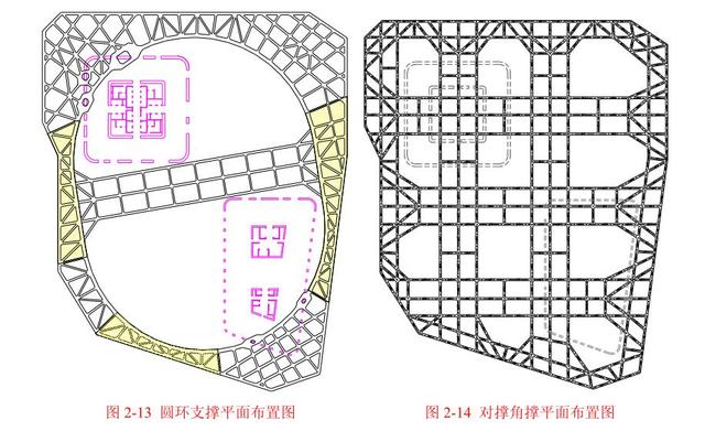 钢筋混凝土支撑体系可采用圆环支撑布置形式(如图 2-13 所示)以及对撑角撑布置形式(如图 2-14 所示),两种支撑体系布置形式各有特点,从技术角度上都能满足本基坑工程的要求。但对比可以发现,本工程采用圆环支撑布置形式,基坑中部的开敞空间更大,利于土方开挖;同时也能够避开绝大部分的塔楼核心筒与框架柱,有利于地下结构的施工。因此方案设计最终确定了采用圆环支撑布置形式。