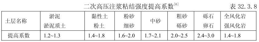 目前常用的锚杆注浆工艺有一次常压注浆和二次压力注浆。一次常压注浆是浆液在自重压力作用下充填锚杆孔,有的在浆液渗入土体液面下降后再进行二次补浆,均属于一次常压注浆。二次压力注浆需满足二个指标,一是第二次注浆时的注浆压力,一般需不小于 1.5MPa,二是第二次注浆时的注浆量。满足这二个指标的关键是控制浆液不从孔口流失。一般的做法是,或者在锚杆锚固段起点处设置止浆装置,或者是在一次注浆锚固体达到一定强度后进行第二次注浆。尤其当锚杆位于地下水位以下时,二次高压注浆是确保锚杆质量的重要措施。试验表明,二次高压注浆可使土体的粘结强度提高 20%~200%(表 32.3.8),提高幅度与土层特性、二次高压注浆量、注浆压力等有关。