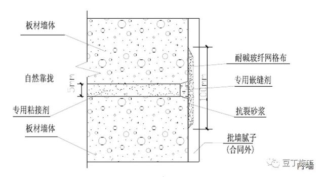 第二片板材安装时,需于板材接缝处涂刷专用粘结剂,专用粘结剂要随配随用,配置的粘结剂应在说明书要求时间内用完。墙板拼接时板缝缝宽不应大于5mm,安装时应以缝隙间挤出砂浆为宜。在墙体粘缝没有产生一定强度前,严禁碰撞振动,造成松脱。