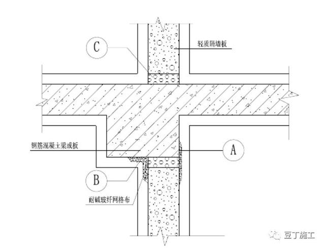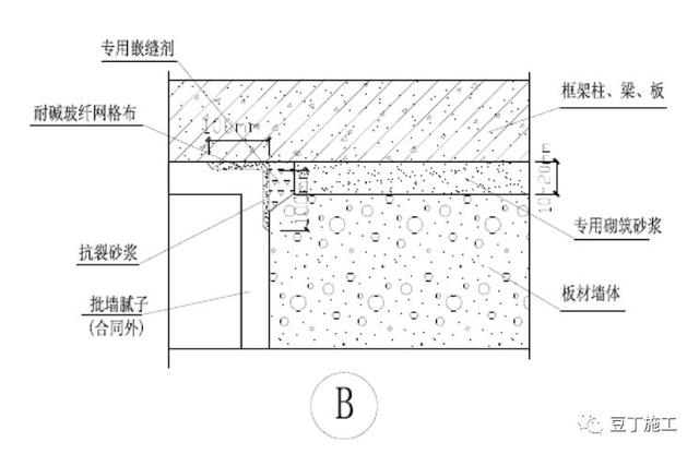 蒸压加气混凝土板与其它墙、梁、柱相连接时,端部必须留有10mm-20mm缝隙,缝中应用专用嵌缝剂填充。板材与钢筋混凝土墙、柱、梁交接处采用耐碱玻璃纤维网格布压入抗裂砂浆以防止接缝处开裂。