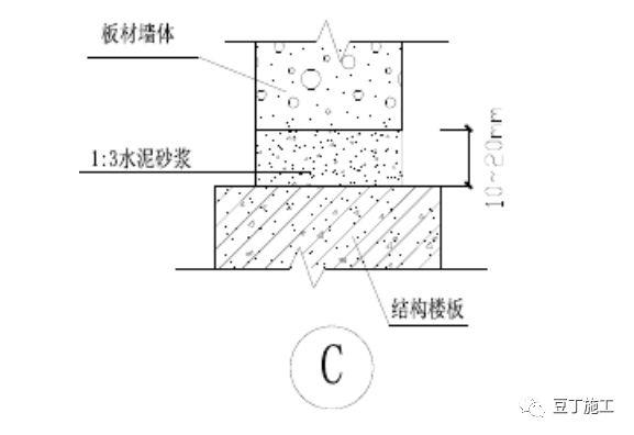 板材下端与楼面处缝隙用1:3水泥砂浆嵌填密实。木楔应在水泥砂浆凝固后取出,且填补同质材质。示意图如下。