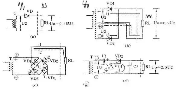 半波整流电路只需一个二极管,见图 2 ( a )。在交流电正半周时 VD 导通,负半周时 VD 截止,负载 R 上得到的是脉动的直流电