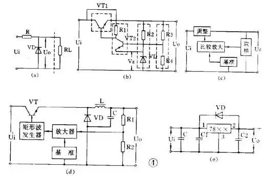 图 4 ( e )是一个三端稳压器电路。图中 C 是主滤波电容, C1 、 C2 是消除寄生振荡的电容 ,VD 是为防止输入短路烧坏集成块而使用的保护二极管。