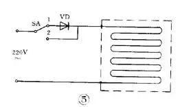 图 5 是一个电热毯电路。开关在 1 的位置是低温档。 220 伏市电经二极管后接到电热毯,因为是半波整流,电热毯两端所加的是约 100 伏的脉动直流电,发热不高,所以是保温或低温状态。开关扳到 2 的位置, 220 伏市电直接接到电热毯上,所以是高温档。