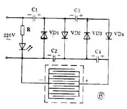 图 6 是利用倍压整流原理得到小电流直流高压电的灭蚊蝇器。 220 伏交流经过四倍压整流后输出电压可达 1100 伏,把这个直流高压加到平行的金属丝网上。网下放诱饵,当苍蝇停在网上时造成短路,电容器上的高压通过苍蝇身体放电把蝇击毙。苍蝇尸体落下后,电容器又被 充电,电网又恢复高压。这个高压电网电流很小,因此对人无害。