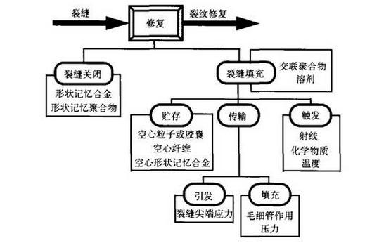 仿生自愈合法是一种新的裂缝处理方法,它模仿生物组织对受创伤部位自动分泌某种物质,而使创伤部位得到愈合的机能,在混凝土的传统组分中加入某些特殊组分(如含粘结剂的液芯纤维或胶囊),在混凝土内部形成智能型仿生自愈合神经网络系统,当混凝土出现裂缝时分泌出部分液芯纤维可使裂缝重新愈合。
