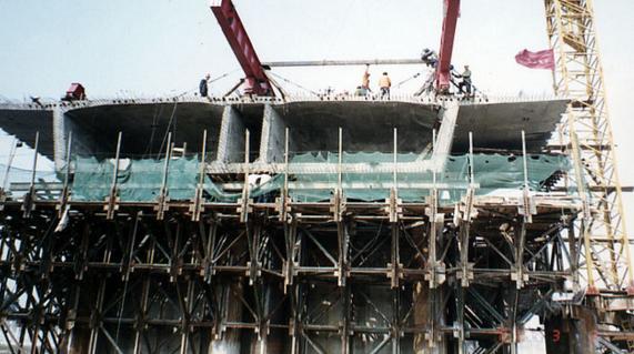 ①装设支架时须严格控制支架位移。允许支架顶部出现小程度的位移。为避免底模板和支架对合龙段的约束力过大,允许底模板和支架之间存在微量的水平位移,以提高模架对现浇段梁体随温度纵向位移及混凝土收缩变形的适应性。钢筋滚筒安放于支架下的混凝土基础顶面,以便挂篮模架、模板和新浇混凝土顺桥轴方向随箱梁作微量的水平移动。