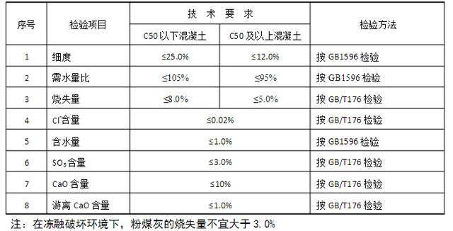 粉煤灰是由燃烧煤粉的锅炉烟气中收集到的细粉末,其形状多成球形,表面光滑。用其做掺合料可以节约水泥和改善混凝土的技术性能,可以改善混凝土的和易性,降低混凝土的水化热,尤其是在大体积混凝土中起到的效果更加明显;提高混凝土抗渗性;抑制碱骨料反应;在粉煤灰进场前应及时进行检测,检测合格后再进场,确保粉煤灰质量。根据TB10424-2011标准规定粉煤灰的性能应符合下表。