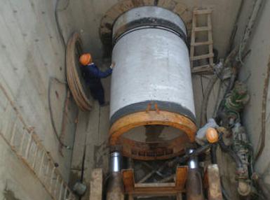 (4)、卸下顶铁,下管,用环形橡胶环连接混凝土管,以保证接口缝隙和受力均匀,保证管与管之间的连接安全。