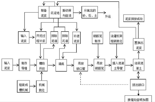 测量放线导墙施工泥浆配制槽段开挖清基锁口管吊放钢筋笼吊放砼浇注锁口拔出墙趾注浆