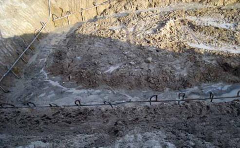 基坑土方大开挖时,桩间如有掺水,视渗水面积及渗水量的大小。如果出现渗水量小,采用水泥砂浆掺一定量的水玻璃加以修补;如果出现局部渗水量较大,则在出水处设置引流管,引至基坑边的排水沟,汇至集水井用水泵抽出;如果出现渗水面积大,则在该处坡上桩边采用地质钻机引孔,压密注浆止水。