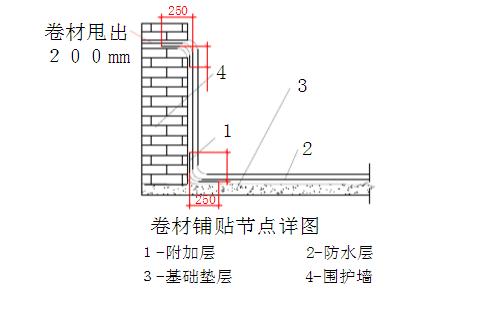 b.在混凝土垫层上,结构墙外侧砌一定高度的永久性保护墙,墙高为底板混凝土厚度加200-500mm。墙下干铺一 层油毡隔离层。