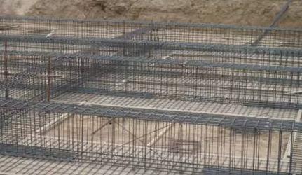 (2)绑扎基础梁,在模扳支好后绑扎,按箍筋间距在模板一侧划好线放箍筋后穿入受力钢筋。绑扎时箍筋应受力钢筋垂直,并沿受力钢筋方向相互错开。各受力钢筋之间的绑扎接头位置应相互错开,并在中心和两端用铁丝扎牢。Ⅱ级钢筋的弯曲直径不宜小于4d,箍筋弯钩的弯曲直径不小于2.5d,弯后的平直长度不小于10d,并做135。弯勾。在钢筋绑扎好后应垫水泥垫块,数量为8块/M2。后浇带处钢筋放置按图纸要求附加钢筋,并在断面放置同梁高、宽相同的钢丝网片。