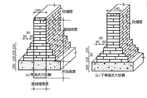 1.砖基础一般做成阶梯形,即大放脚,大放脚有等高式和间隔式。