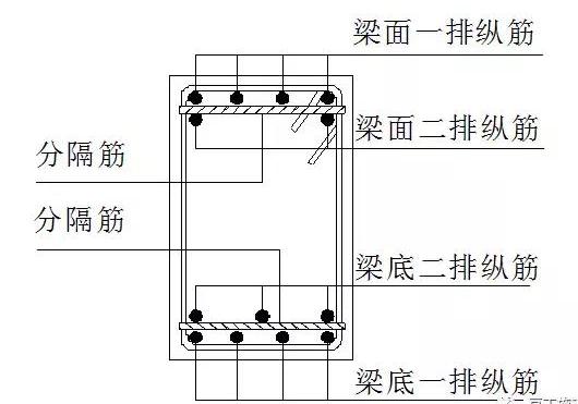 9、梁钢筋一排筋与二排筋采用分隔筋隔开,分隔筋直径主筋直径或25mm;分隔筋距支座边500mm设置一道,中间每隔3m设置一道