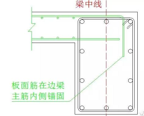 10、板面筋在边支座锚固时,直接延伸到梁最外面一根钢筋的内侧弯下