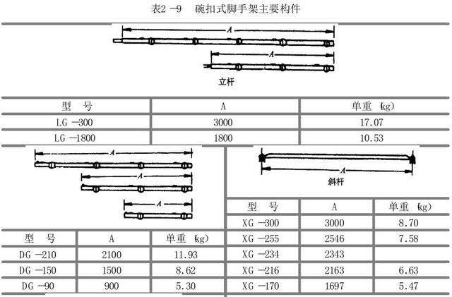 碗扣式钢脚手架的杆件、配件共有23 类,53 种规格,按其用途可分为主要构件,辅助构件和专用构件三类。主构件有6 种,分别是: