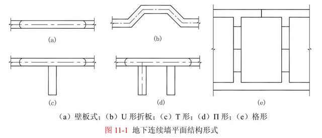T 型(如图 11-1(c)所示)和 П 形地下连续墙(如图 11-1(d)所示)适用于基坑开挖深度较大、支撑竖向间距较大、受到条件限制墙厚无法增加的情况下,采用加肋的方式增加墙体的抗弯刚度。