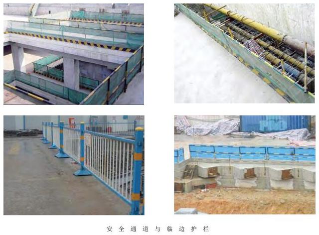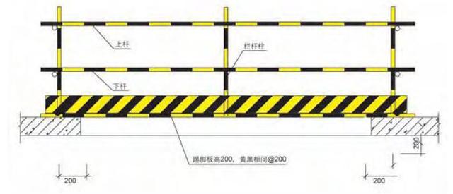 (3)、防护栏杆必须自上而下用密目网封闭,必要时亦可在底部横杆下沿,设置不低于180mm 的踢脚板并固定牢固,踢脚板外侧漆成黄黑斜条块警示色。