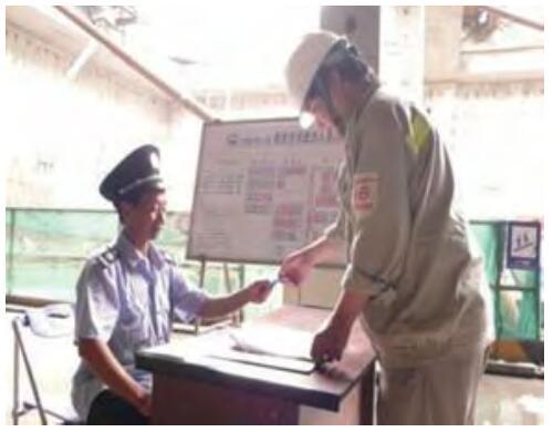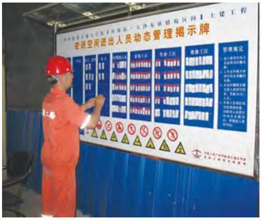 在下井出入口处(井口或中层平台)必须设置下井登记处,并设置专职人员进行管理、下井登记处必须设置动态翻牌和火种的存放处。动态管理牌上必须显示本班作业前的有害气体最大浓度检测值,悬挂允许进入标牌后,人员方可进入密闭空间。进入隧道人员必须佩带上岗卡和正确穿戴劳动防护用品。