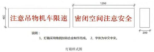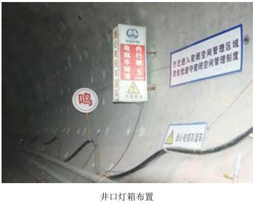 隧道内的警示灯箱布置,在井口正面正五环附近为布置点,左右两侧布置灯箱的种类为当心吊物、严禁搭乘、电机车限速等。灯箱布置可根据隧道管片手孔的特点和测量平台的位置,以直径 40mm 的黄黑警示色钢管进行左右连灯箱的规格一般为 1250x400x200cm。内设环形灯管,正反两面为有机玻璃,标注警示字样或图案。目前灯箱警示种类为:密闭空间注意安全(正面) 注意吊物机车限速(背面)、机车限速、严禁搭乘、当心吊物、禁止吸烟、禁止跨越等。