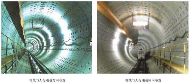 隧道内高压电缆的敷设原则上应与人行通道相对布置,如因条件所限,需设置在人行通道一侧时,其设置高度应高于行人的触摸点。在隧道沿线每间隔 3 环用挂钩挂起,挂钩要用绝缘塑料包裹。电缆布置在挂钩上要保持高度一致,弧度适中。高压电缆每间隔 10 米必须悬挂高压危险警示牌。