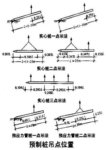 桩的砼强度达到设计强度等级的70%方可起吊,吊点应设在设计规定之处,设计无规定时,应按吊桩弯距最小的原则确定吊点位置。预应力混凝土桩一般采用一点起吊方法,预制混凝土方桩一般采用两点起吊方法。吊桩时要严格遵守安全技术操作规程,防止桩机倾斜及钢丝绳从桩上脱落或断裂。