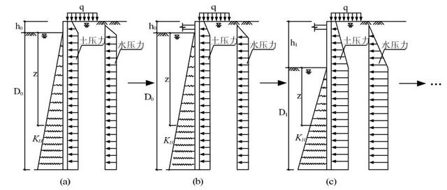 (1)首先挖土至第一道支撑底标高,计算简图如图 6-10(a)所示,施加外侧的水土压力计算此时支护结构的内力及变形;