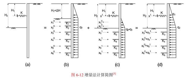 增量法的计算过程如图 6-12 所示。为在开挖面以下 H 1 处加支撑,先开挖到 H 1 +H,此时,相应荷载和计算简图如图 6-12 (b)所示,q 1 为土压力,求解可得开挖面以下土弹簧的反力
