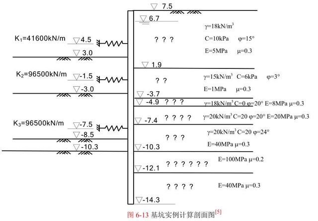 (4)在-7.5m 加第三道支撑,由-8.5m 开挖到-10.3m。各道支撑刚度及开挖和加撑过程如图 6-13 所示。