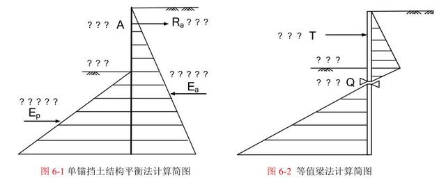 等值梁法,又称假想铰法,可以求解多支撑(锚杆)的挡土结构内力。首先假定挡土结构弹性曲线反弯点即假想铰的位置。假想铰的弯矩为零,于是可把挡土结构划分为上下两段,上部为简支梁,下部为一次超静定结构(图 6-2),这样即可按照弹性结构的连续梁求解挡土结构的弯矩、剪力和支撑轴力。等值梁法的关键问题是确定假想铰 Q 点的位置。通常可假设为土压力为零的那一点或是挡土结构入土面的那点,也可假定 Q 点距离入土面深度为 y,该 y 值可根据地质条件和结构特性确定,一般为(0.1~0.2)倍开挖深度。