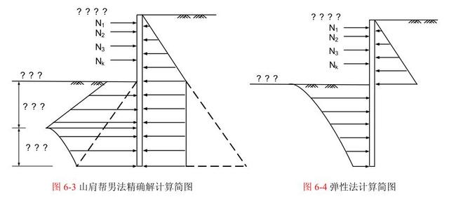 基本求解过程是首先建立弹性微分方程,再根据边界条件和连续条件,导出第 k 道横撑轴力的计算公式及变位和内力公式。由于山肩帮男法的精确解计算方程中有未知数的五次函数,计算较为繁复。山肩帮男法的近似解法对上述基本假定做了修改,只需应用两个平衡方程就可依次求得各道横撑内力。弹性法与山肩帮男法在基本假定上基本相同,只有在对土压力的假定有差别。弹性法中假设主动侧土压力已知,但开挖面以下只有被动侧的土抗力,被动侧的土抗力数值与墙体变位成正比(图 6-4)。
