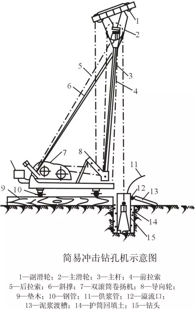 ①冲击钻机通过机架、卷扬机把带刃的重钻头(冲击锤)提高到一定高度,靠自由下落的冲击力切削破碎岩层或冲击土层成孔。