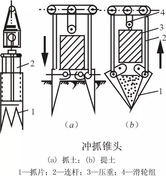 ① 冲抓锥锥头上有一重铁块和活动抓片,通过机架和卷扬机将冲抓锥提升到一定高度,下落时松开卷筒刹车,抓片张开,锥头便自由下落冲入土中,然后开动卷扬机提升锥头,这时抓片闭合抓土。冲抓锥整体提升至地面上卸去土渣,依次循环成孔。