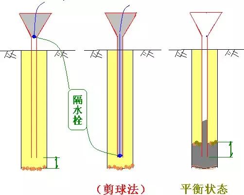 浇筑时,先将导管内及漏斗灌满混凝土,其量保证导管下端一次埋入混凝土面以下1.0m以上,然后剪断(或迅速拔出)悬吊隔水栓的钢丝,混凝土拌和物在自重作用下迅速排出球塞进入水中。