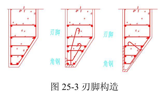 刃脚的作用为切土下沉,故必须有足够的强度,以免破损。通常称刃脚的底面为踏面,踏面的宽度依土层的软硬及井壁重量、厚度而定,一般为 15~30 cm,刃脚侧面的倾角通常为 45~60。刃脚高度一般应综合考虑沉井封底方式、便于抽取刃脚下的垫木及土方开挖等方面。湿封底时高度大些,干封底时高度小些。其构造如图 25-3 所示
