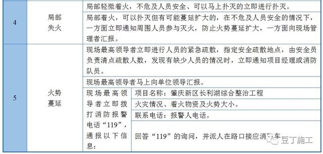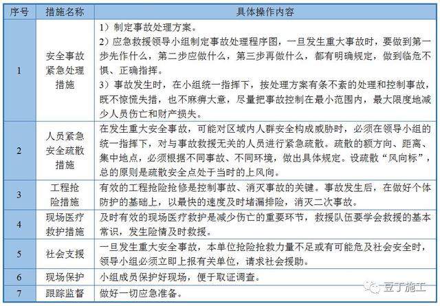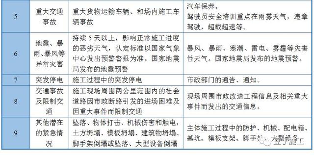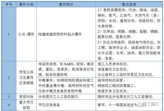 建筑现场施工是一项作业环境复杂、事故隐患较多的工作,施工现场随时都有可能发生各种突发事件。我公司将根据现场环境及工程特点,结合我公司以往承建类似大型项目积累的丰富应急经验,针对可能出现的各种紧急情况,制定切实可行的应急处理措施和预案,从而达到抵抗风险、消除隐患、保障施工的目的。经过辨识,本工程重大事件包括以下9项,详见表4-1重大事件的辨识及监测。