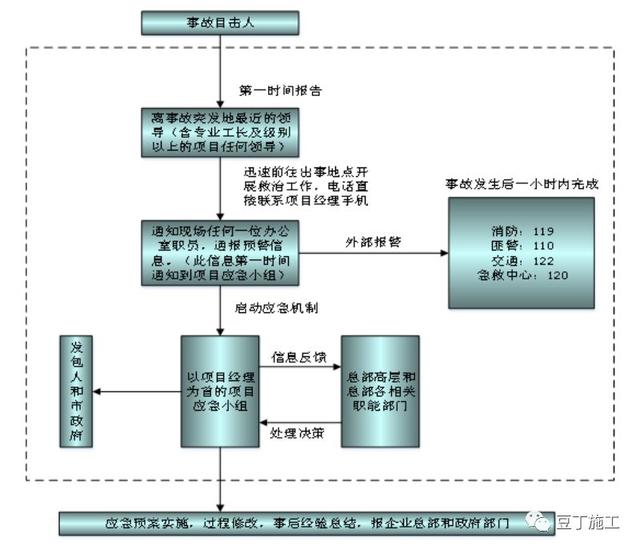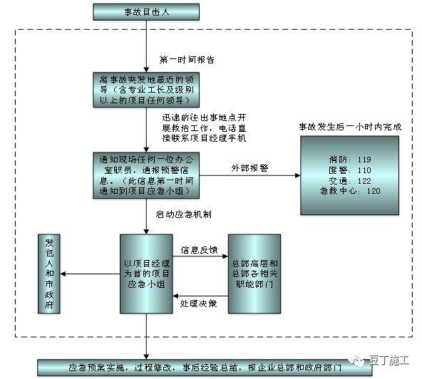 事故发生后一小时内,启动应急机制,同时上报业主和西宁市政府。全天24小时进入应急状态。事后处理报告提交企业总部、发包人、政府部门48小时后,应急状态解除。