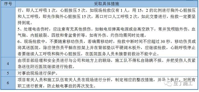 电击伤俗称触电,是由于电`2处以上的创口,1个入口、1个或几个出口,重者创面深及皮下组织、肌腱、肌肉、神经,甚至深达骨骼,呈炭化状态。发生触电事故时,应按照应急程序进行表4.5-1所示措施。