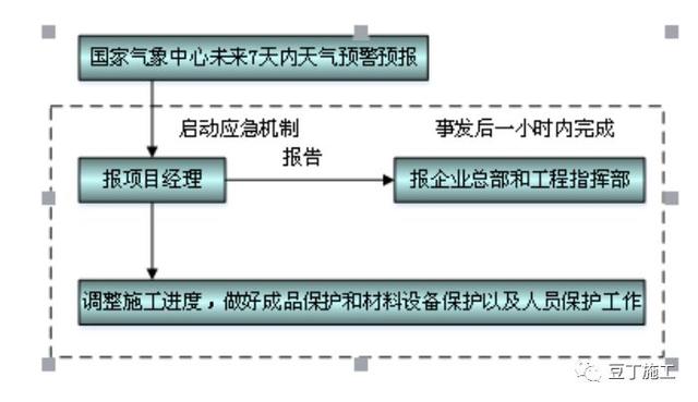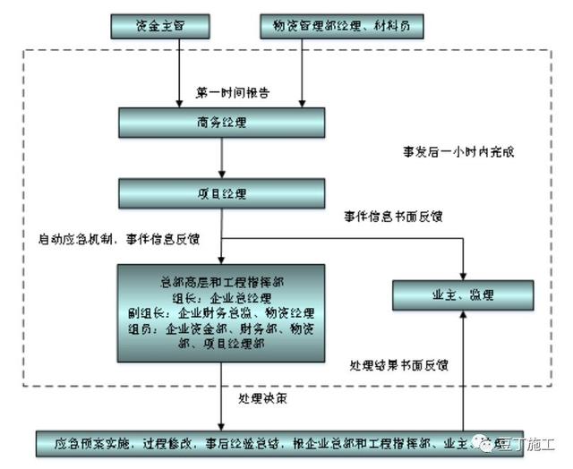 (1)资金主管、物资管理部经理、材料员随时跟踪资金和物资到位的情况,收集事件可能发生的信息,提前向企业总部、业主、监理发出事件书面预警,做好资金、物资的调配工作,调整工程进度,将影响工程的因素降到最低。