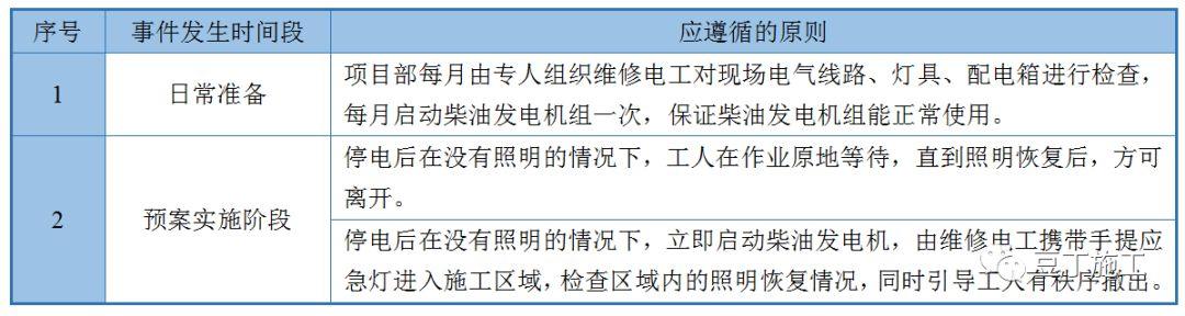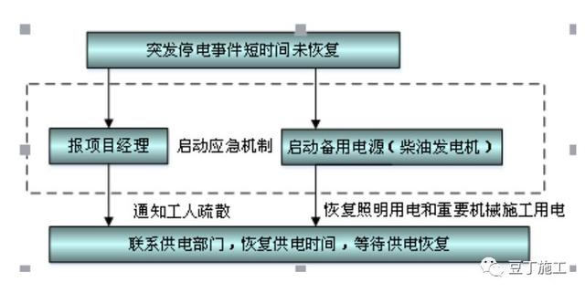 为防止施工过程中市政供电线路突然断电,造成现场重要机械停止运行及重要部位无动力和照明等情况,引起安全意外事故的发生,采取以下措施。