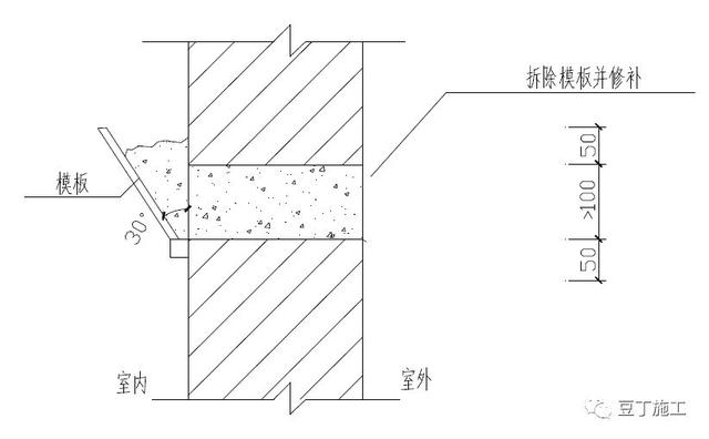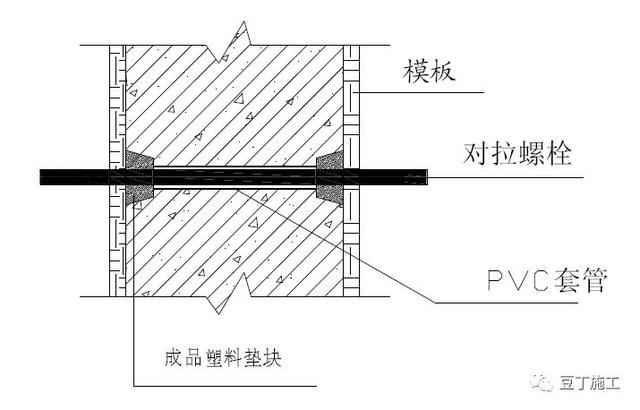 采用一次性穿墙对拉螺杆时,螺杆两端(模板内侧)必须采用锥形塑料垫块。拆除模板后逐个剔除塑料垫块,然后将螺杆从孔口的最深处割断,再用干硬性水泥砂浆封堵。