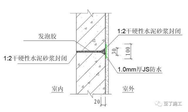 待外侧水泥砂浆干燥、孔内发泡胶施工完毕后且检查打发泡胶时对外侧封堵砂浆没有造成挤压破坏时,在外侧孔洞周边分多遍涂刷1.0mm 厚JS 防水,涂刷范围为100100mm。